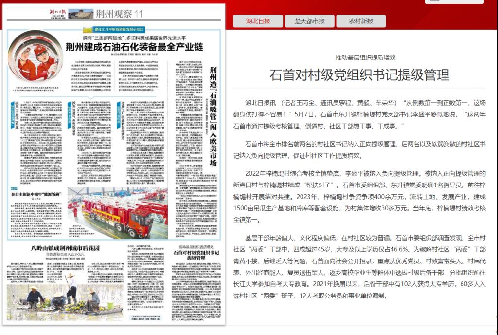 5月13日,《湖北日报》以《推动基层组织提质增效——石首对村级党组织书记提级管理》为题,报道我市石首市基层党建经验做法。针对基层干部年龄偏大、文化程度偏低的特点,石首市委组织部分批组织村级后备干部前往长江大学87365最快检测中心参加学历教育,收效斐然。