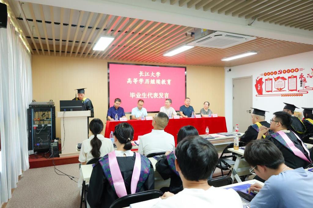 2024届庄晨彬同学作为毕业生代表发言,感谢母校两年多来的教育和培养;感谢教学点教学、教务老师给予源源不断的关怀和鼓励;感谢家人在学习过程中所给予的体谅。他表示今天的毕业典礼只是意味着一个短暂的结束,一个崭新的开始正悄然而生,本科结束了,还可以再申请层次更高的学历。期待两三年之后,大家还会在此进行着研究生班的毕业典礼。